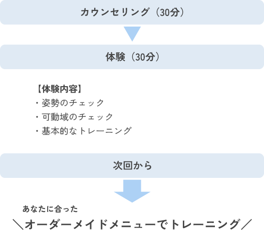 ストレッチ、筋トレ、有酸素運動など、運動の種類に拘らず、あなたのお悩みやその日の体調に合わせてオーダーメイドエクササイズを行います。